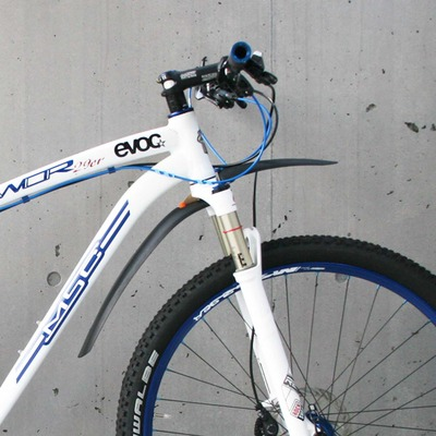 従来のショックボードより全長が60mm長くなり、29インチまで対応するフロント用マッドガード。 ほとんどのステアリングコラムの内径に対応しており、ワンプッシュで行える容易な脱着が特徴です。 マッドガード本体はワンタッチで着脱が可能です。