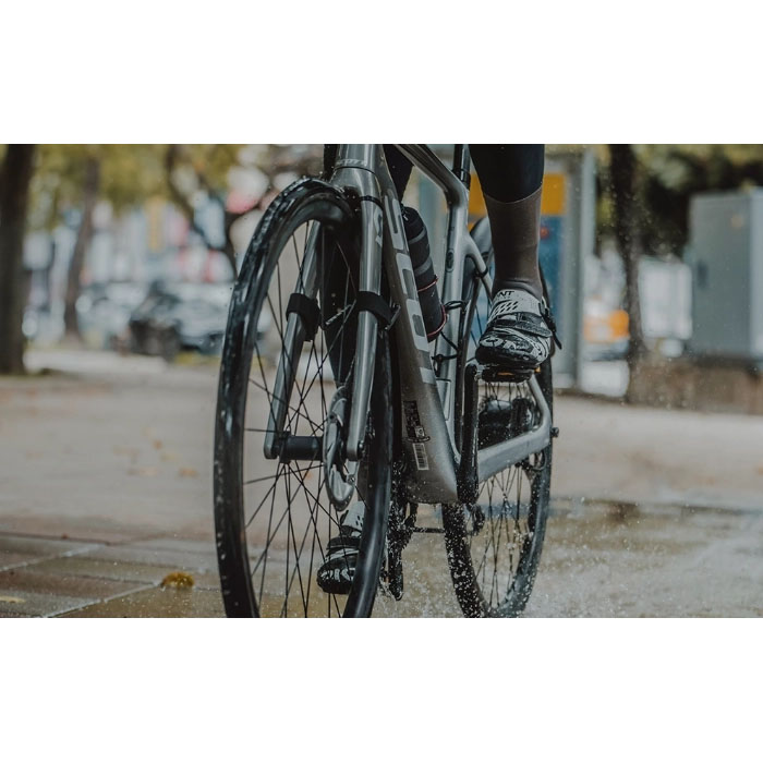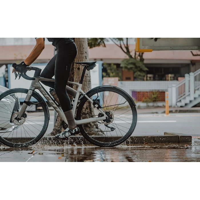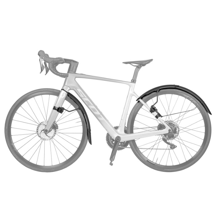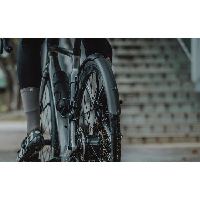 700Cロードバイク向けのクイックマウントフェンダーセットです。R1(フロント)はフロントフォークに面ファスナーで簡単装着でき、調整可能なステーで、泥や水からに防ぎます。R2(リア)はリアシートステーに固定し、2ピース構造で長さ調整が可能。どちらも高光沢仕上げで汚れが付きにくく、3M反射デカール付きで夜間の視認性も向上。ディスクブレーキ対応フレーム専用で、700×25~32cタイヤに対応します。