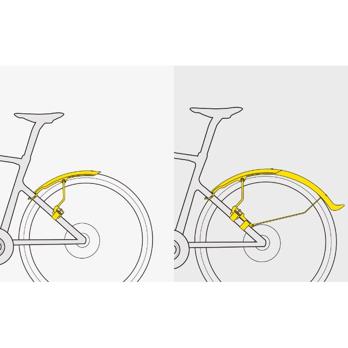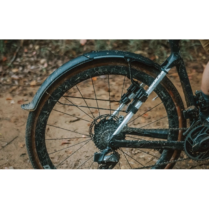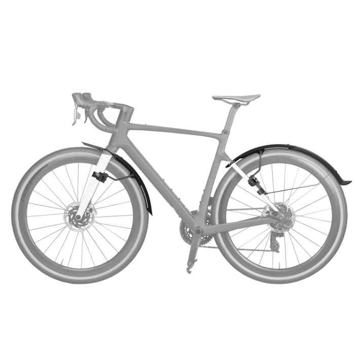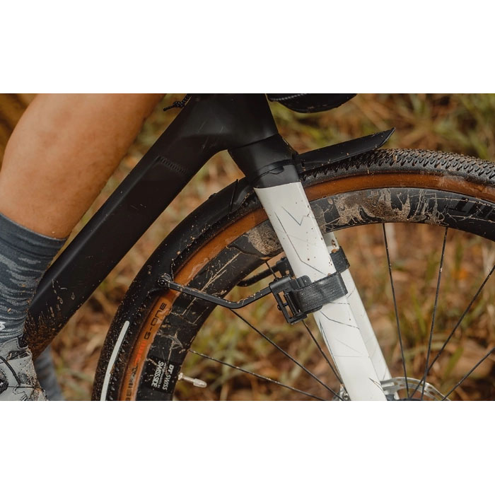 グラベルバイク向けのクイックマウントフェンダーセットです。G1(フロント)はフロントフォークに面ファスナーで簡単装着でき、調整可能で泥や等を効果的に防ぐことが可能です。G2(リア)はリアフレームに面ファスナーで固定し、フェンダーの長さを調整可能。2ピース構造で短め・長めの使用が選べ、最適長さで利用可能です。どちらも高光沢仕上げで汚れが付きにくく、お手入れも簡単。3Mの反射デカール付きで夜間の視認性も向上します。