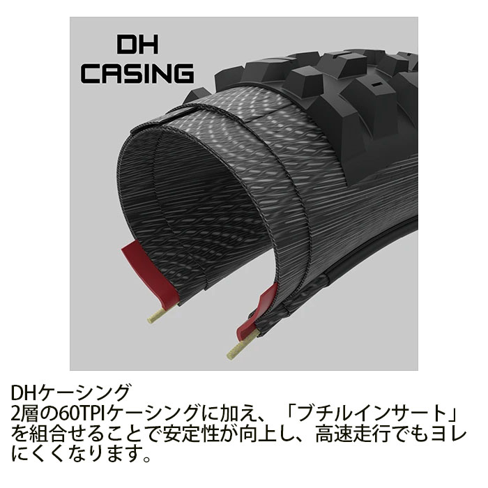 トレイル・エンデューロ・ダウンヒル対応のリア用タイヤとして、あらゆる路面で高い制動力とコーナリング性能を発揮。サイドノブは「ミニオン DHF」をベースに、リアタイヤとしてのコントロール力を高めるべくボリュームアップさせています。サイプを施したセンタートレッドは、転がりの軽さをもたらしブレーキング時のヨレを防ぎます。