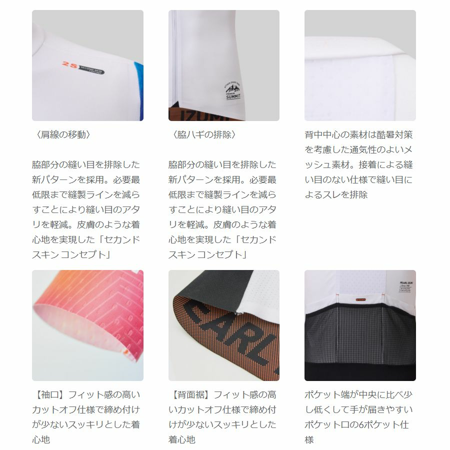 縦横自由にストレッチする通気性の高い薄手軽量素材を適所に採用し、今シーズンは脇部分の縫いも排除し、極限まで縫い目を少なくした「セカンド スキン コンセプト」を採用し、皮膚のような身体と一体化したフィット感を実現。