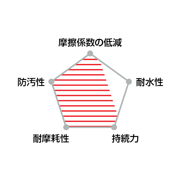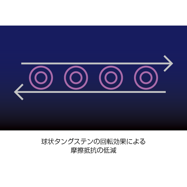 「高精製パラフィン」によってドライで強固なコーティングを形成し、水分と汚れを寄せ付けない「ヘイロー ワックス ルブリカント」。中空のコアで振動摩擦を軽減する「球状タングステン」と、非粘着性の保護コーティングを形成する「セラミック ボロン ナイトライド プレートレット」の相乗効果によって摩擦や摩耗を低減し、ドライブトレインの寿命を延ばします。