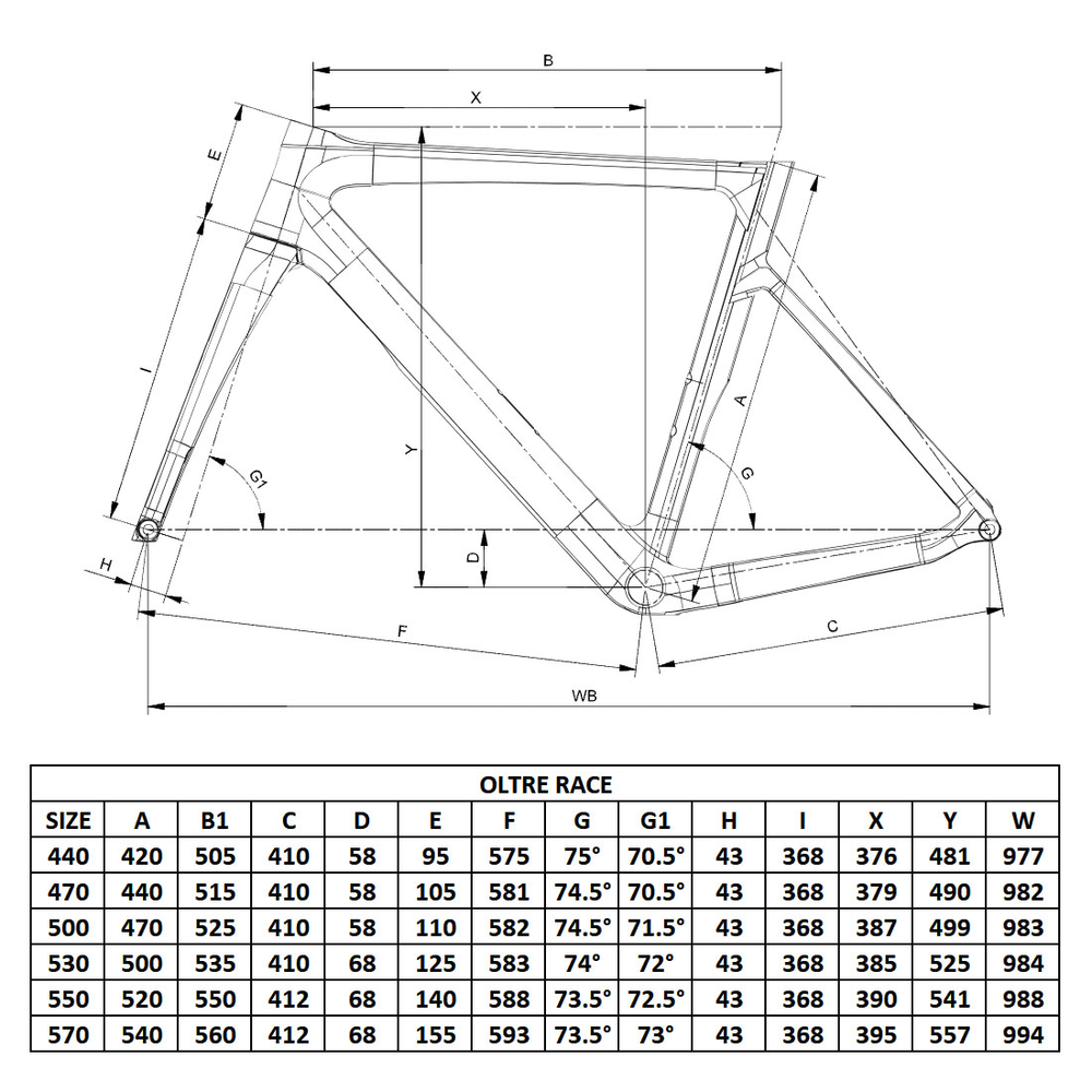 OLTRE RACE AERO CARBON, COMPATIBLE WITH MECHANICAL/ELECTRONIC TRANSMISSIONS, COMPATIBLE WITH INTERNAL CABLE ROUTING, BB-PRESSFIT 86,5X41, INTEGRATED SEAT CLAMP, DISC BRAKE FLAT MOUNT, THRU AXLE 12X142 |