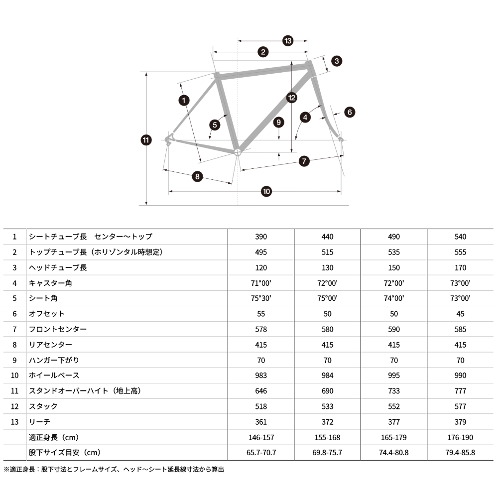 390-440-490-540mm(適正身長はジオメトリー欄を参照) |