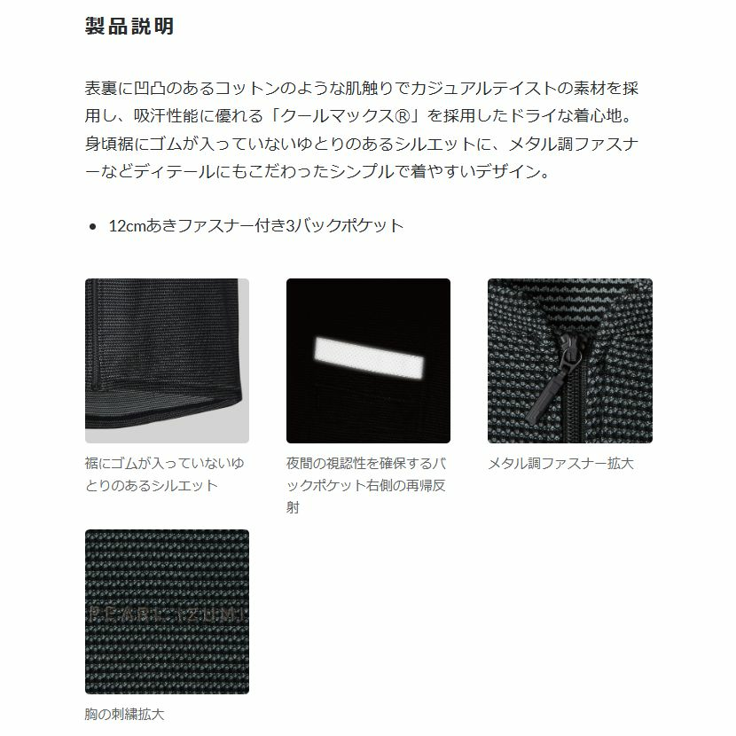 表裏に凹凸のあるコットンのような肌触りでカジュアルテイストの素材を採用し、吸汗性能に優れる「クールマックスⓇ」を採用したドライな着心地。身頃裾にゴムが入っていないゆとりのあるシルエットに、メタル調ファスナーなどディテールにもこだわったシンプルで着やすいデザイン。