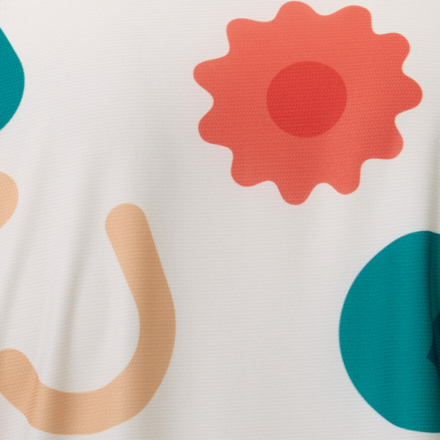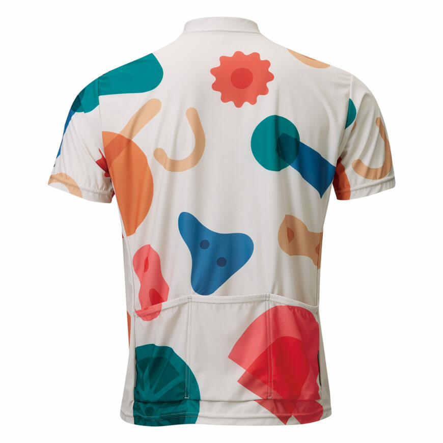 「BIKE LIFE」をテーマに各シーンを切り抜いたポップなプリントグラフィック。身頃裾にゴムが入っていないゆとり感のあるシルエットの半袖ジャージ。バックポケットや再帰反射などサイクリングに必要な機能も装備しています。