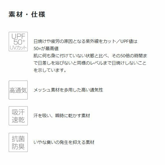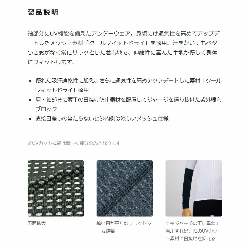 袖部分にUV機能を備えたアンダーウェア。身頃には通気性を高めてアップデートしたメッシュ素材「クールフィットドライ」を採用。汗をかいてもベタつき感がなく常にサラッとした着心地で、伸縮性に富んだ生地が優しく身体にフィットします。