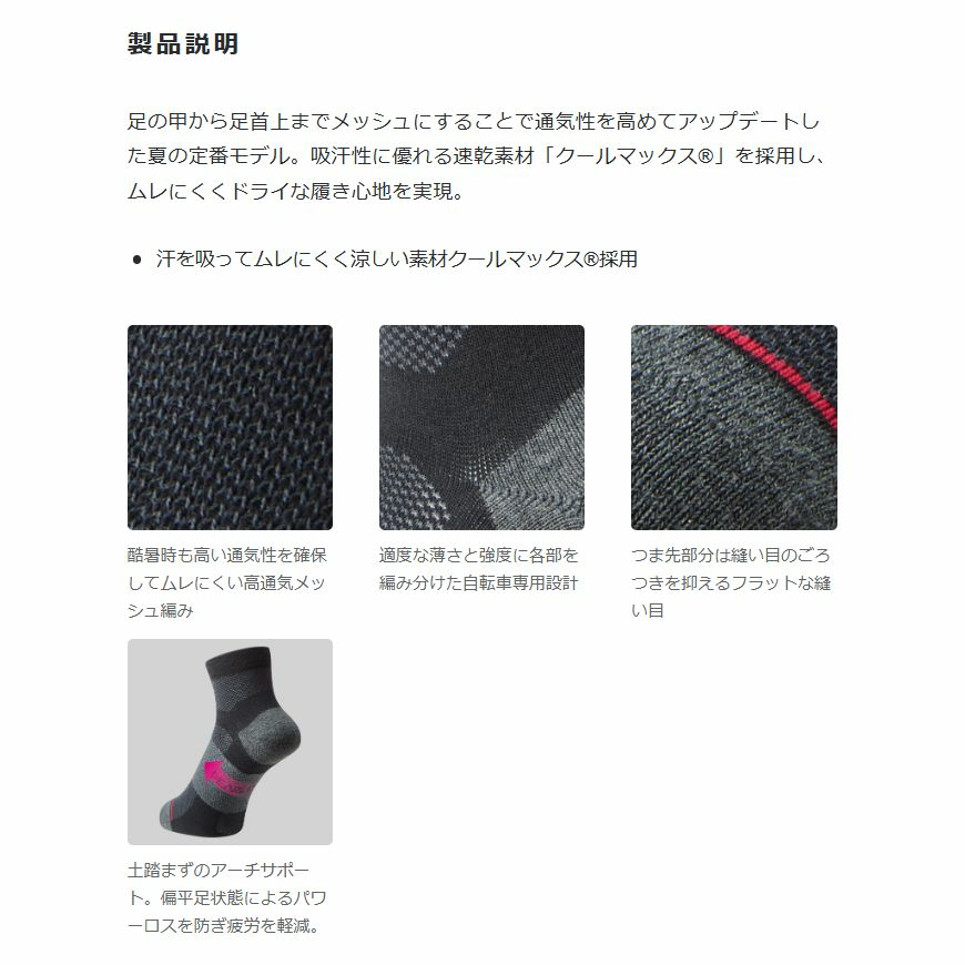 足の甲から足首上までメッシュにすることで通気性を高めてアップデートした夏の定番モデル。吸汗性に優れる速乾素材「クールマックス」を採用し、ムレにくくドライな履き心地を実現。