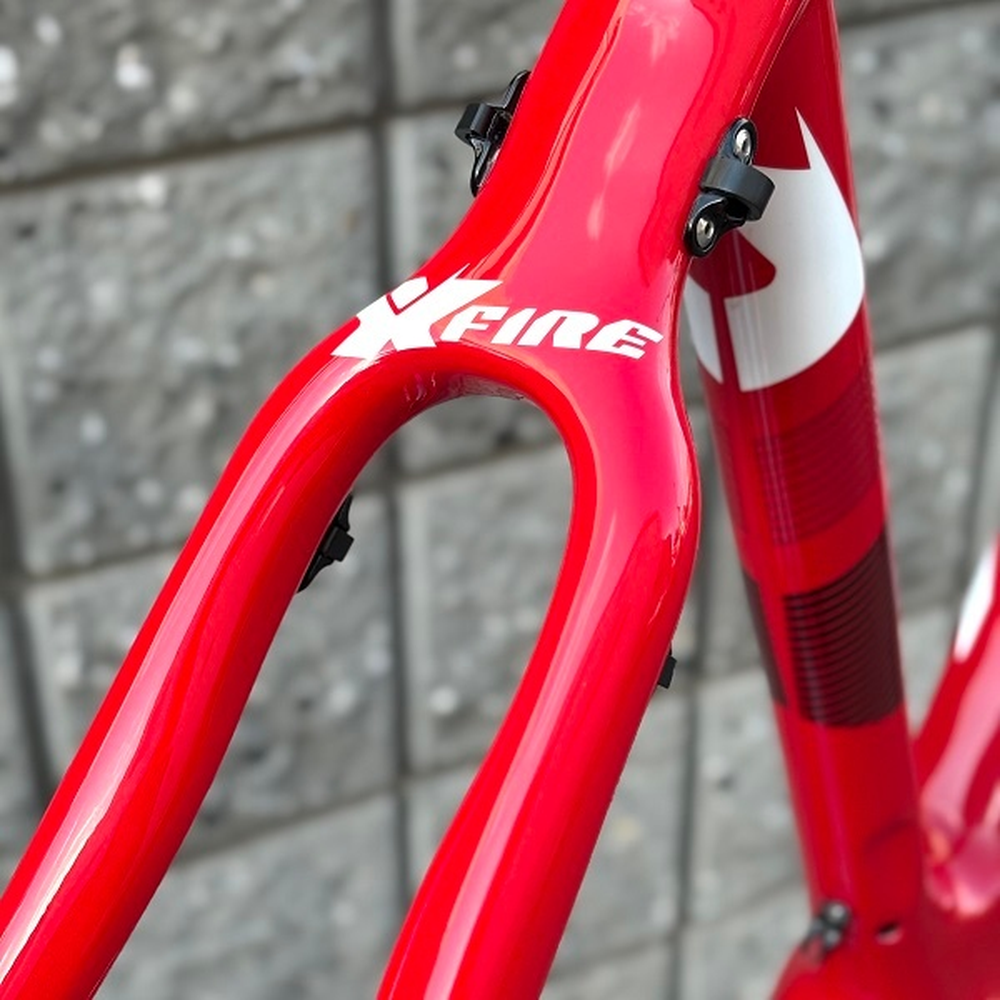 X-FIREはハイエンドモデルのX-NIGHT登場前までのプロユースモデルで、世界チャンピオンに輝いた実績を持つレーシングCXバイク。素材には24tクラスのHMカーボンを使用し、マッシブなチューブ形状やPF30規格のオーバーサイズBBと併せて剛性や走りの軽さを追求している。ヘッドチューブは下側1-1/2インチの上下異径とし、安定感あるハンドリングやブレーキフィーリングを実現した。