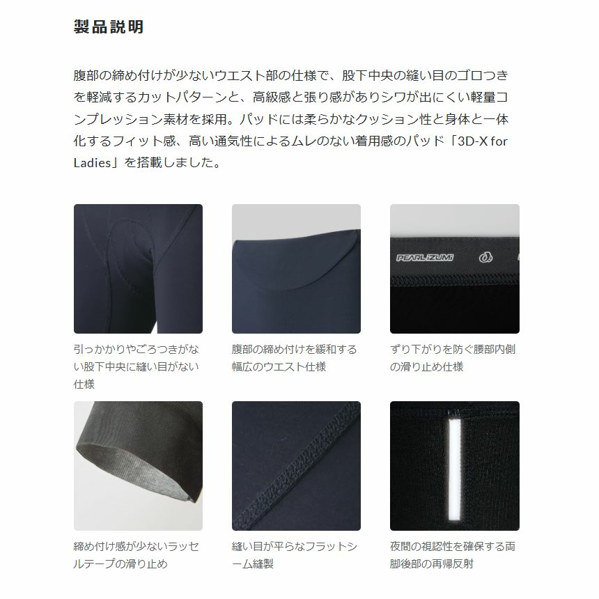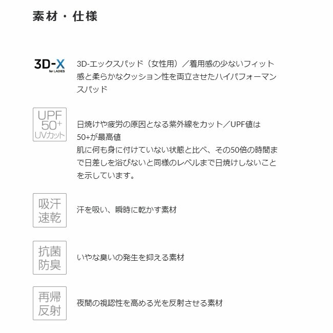 腹部の締め付けが少ないウエスト部の仕様で、股下中央の縫い目のゴロつきを軽減するカットパターンと、高級感と張り感がありシワが出にくい軽量コンプレッション素材を採用。パッドには柔らかなクッション性と身体と一体化するフィット感、高い通気性によるムレのない着用感のパッド「3D-X for Ladies」を搭載しました。