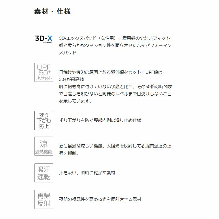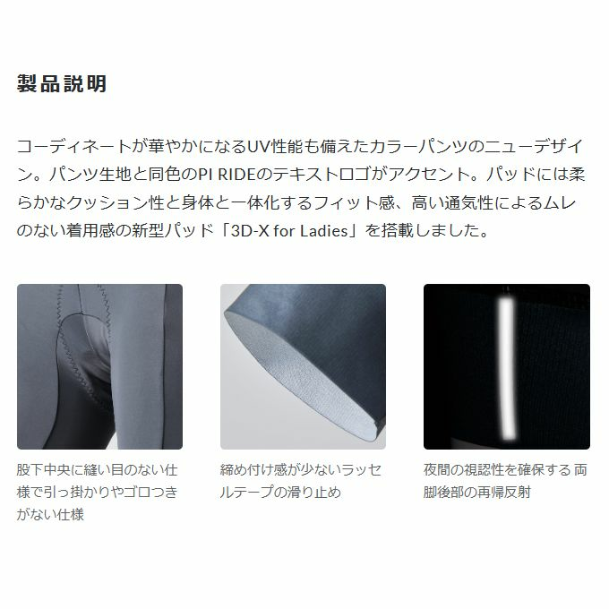 コーディネートが華やかになるUV性能も備えたカラーパンツのニューデザイン。パンツ生地と同色のPI RIDEのテキストロゴがアクセント。パッドには柔らかなクッション性と身体と一体化するフィット感、高い通気性によるムレのない着用感の新型パッド「3D-X for Ladies」を搭載しました。