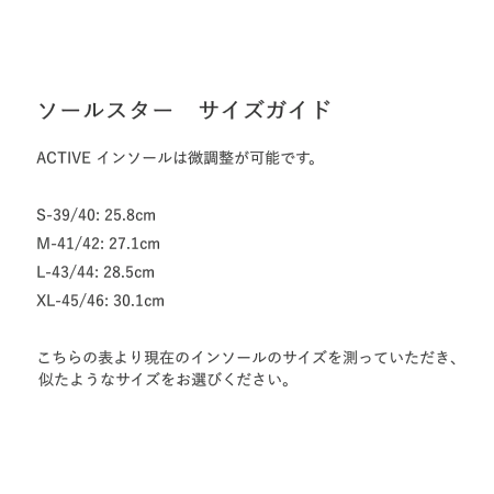 SOLESTAR ACTIVE インソールは、革靴やスニーカーに入れると一日中快適に過ごせます。軽量、安定化要素、クッション性のおかげで、数時間履いた後でも羽のように軽く感じられます。(ただし、スポーツ使用には向きません) クッション性のあるポリエステル/EVAフォームとポリエステルカバー付き 前足部の薄さは 3mm