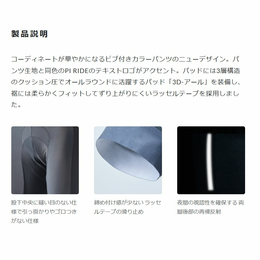 コーディネートが華やかになるビブ付きカラーパンツのニューデザイン。パンツ生地と同色のPI RIDEのテキストロゴがアクセント。パッドには3層構造のクッション圧でオールラウンドに活躍するパッド「3D-アール」を装備し、裾には柔らかくフィットしてずり上がりにくいラッセルテープを採用しました。
