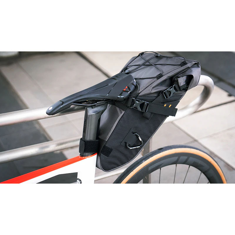 すべてのラッドテイルサドルバッグには、さまざまな用途や用途に対応した独自の三角形カラビナが付属しています。バランスの取れた安定化のために、Radtail GT Maxは1つのベルクロと2つのバックルを備えています。