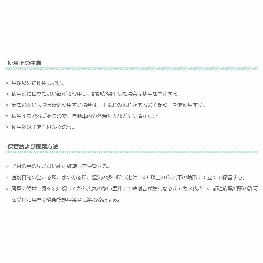 ● 廃棄の際は中身を使い切ってから火気のない屋外にて噴射音が無くなるまでガス抜きし、都道府県知事の許可を受けた専門の廃棄物処理業者に業務委託する。