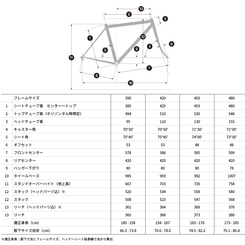 390-420-450-480mm(適正身長はジオメトリー欄を参照) |