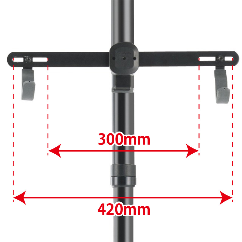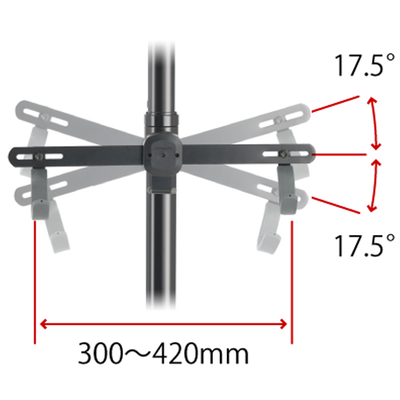 - クレードルは高さ調整、角度調整が簡単に行えます。(角度:上下17.5°、フック間隔:300~420mm)