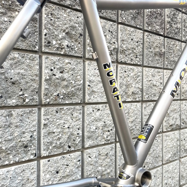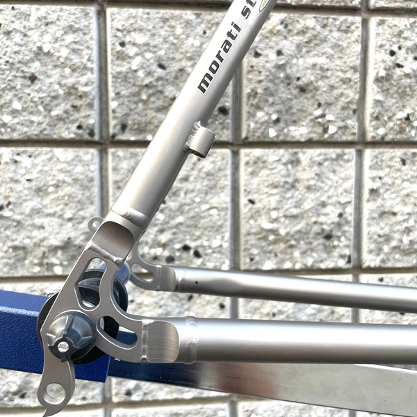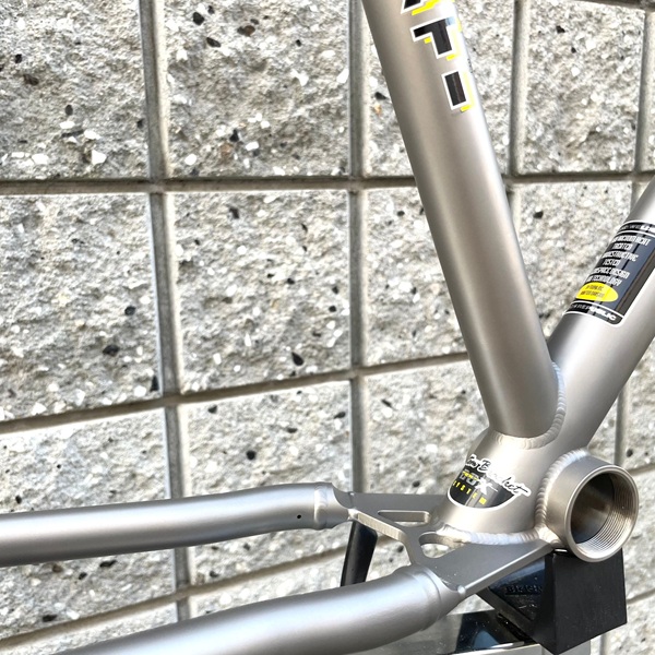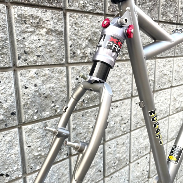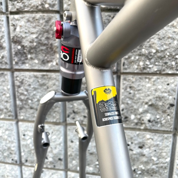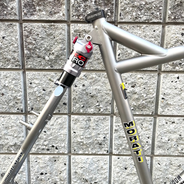 激レアMTBチタンフレーム。サスペンションを採用したソフトテールMTBチタンフレームです。MORATI独自の BBシステム (B-B Box system)によりBB剛性を保ちながら、振動吸収性の高いチェーンステーとの両立が可能となりました。