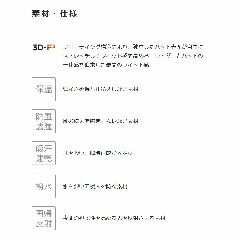 最新の超立体パターンがスムーズで力強いペダリングを実現。前面は耐水圧10,000mmの防水性能と撥水性能、後部は撥水ストレッチ素材を備えた薄手軽量ビブタイツ。適度な保温力で、秋口~暖冬期まで長い期間着用できます。パッドは高いフィット感を追求した3D-F3を採用。