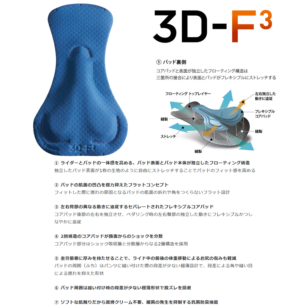 - パッドのフィット感を高めるフローティング構造と、股擦れを排除する表面の凹凸の無いフラット形状の3D-F3パッドを搭載