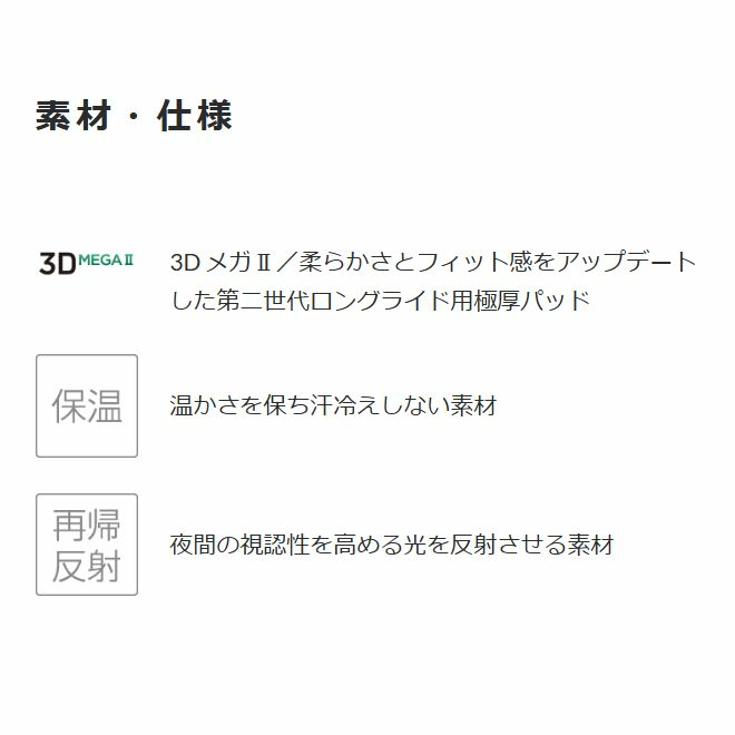 極厚パッド「3D-メガ2」を装備した10℃対応のビブタイツです。腹部の締め付けが少ないビブ仕様で快適なフィット感と着用感。ストレッチ性、保温性に優れた素材「スーパーサーマフリース®プラス」を採用し、高いクッション性を誇るパッドが長時間のライドでもお尻の痛みを和らげます。痛みが不安なビギナーの方や、秋口・春先のロングライドにおすすめです。