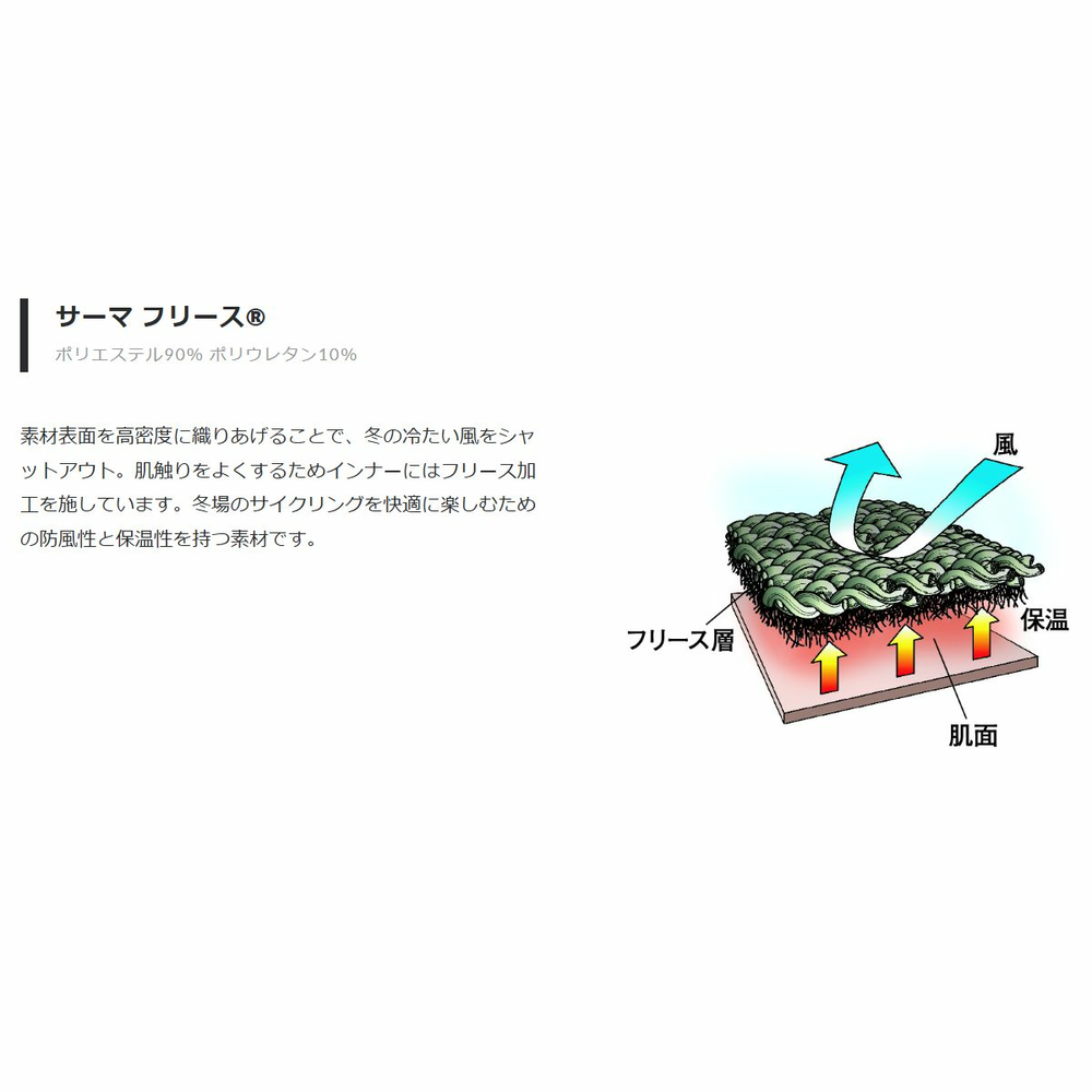 ハイネック仕様で首元まで温かい、5℃対応のサイクル用アンダーウェア。「サーマフリース®」は、防風性と保温性、ストレッチ性を合わせ持ち、肌ざわりが良く身体にフィットして動きやすい素材。優れた吸汗性能で汗冷えもしにくく、高密度に織り上げた素材表面が寒風もブロックします。
