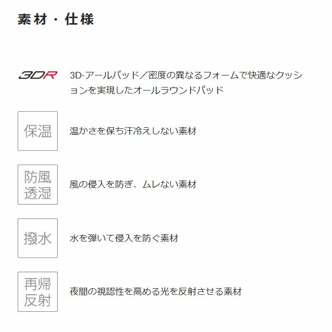 腿、膝、脛の3分割立体設計がさらにスムーズなペダリングを実現した5℃対応モデルです。パッドには3層構造のオールラウンドパッド「3D-アール」を装備しています。風を受ける前面には保温機能はそのままに約20%の軽量化、2wayストレッチ性能に撥水機能をプラスした「ウィンドブレーク®」を採用、優れた透湿機能でムレや汗冷えも軽減します。
