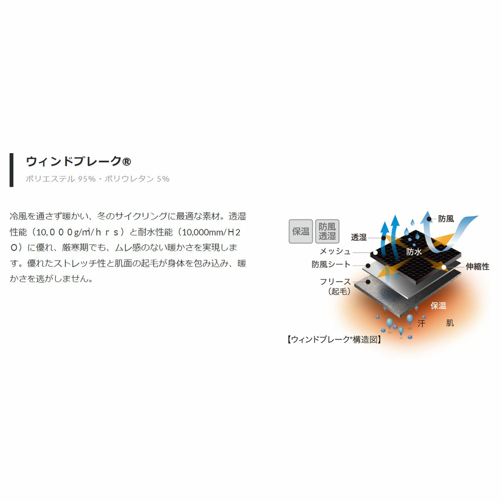 - 前面には防風性の高いウィンドブレーク®を使用