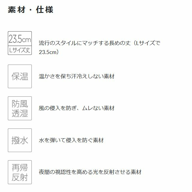 防風性と保温性とを兼ね備え、軽量化、ストレッチ性の向上、撥水性能も追加してアップデートした「ウィンドブレーク®」素材を採用。後部が大きく開くオープンファスナーと足裏のベルクロ仕様で着脱も簡単。丈も長めにアップデートしてよりスタイリッシュな印象に。
