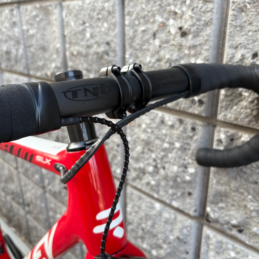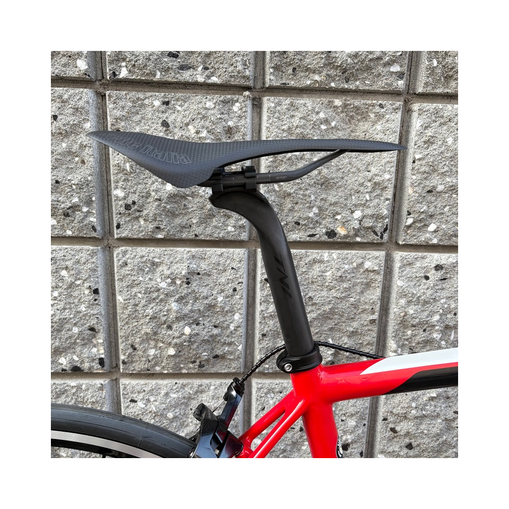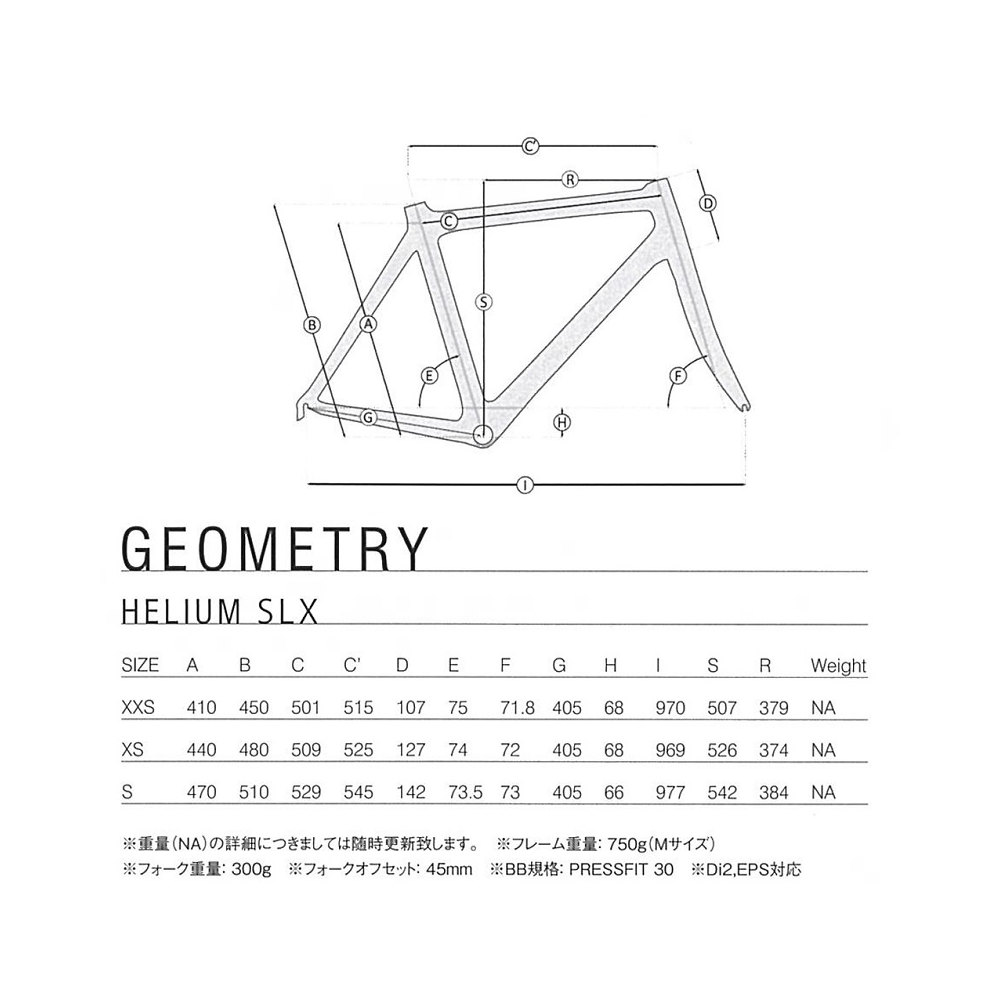 プロレースからフィードバックを受け、フルモデルチェンジを遂げたヘリウムSLX。 ボリュームアップしたトップチューブ、ヘッドチューブ、ダウンチューブのフロントトライアングルはさらなる剛性アップに貢献。トッププロライダーの強靭なパワーをロスすることなくしっかりと受け止めます。それでも尚、フレーム重量は750gを達成。異次元の軽量性はさらなる登板路でも最高のパフォーマンスを引き出します。もちろんヘリウム電灯の細身なシートステーを継承し、その高い振動吸収性は過酷なパヴェ(石畳)でのテストで実証済。またケーブル類のワイヤリングを見直し、ブレーキ系ブルも内装に変更。無理のないケーブルの取り回しはよりスムーズなハンドリングを実現しました。ストレートタイプに刷新されたフロントフォークは優れた反応性とコーナリングを発揮します。上側 1-1/8・下側 1-1/4とした上下異径のヘッドチューブやプレスフィットBB30、左右非対称チェーンステー等、最先端テクノロジーを継承。レーシングバイクとして求められる性能を高次元で達成したスーパーライトオールラウンダーバイクです。