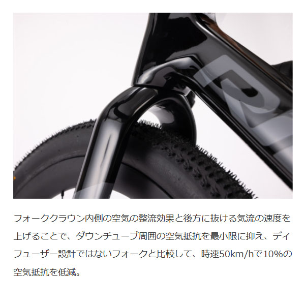 空力性能を追求しながらも軽量化を達成するために行われたのが、フレームに使用される余分な素材の削減とチューブ形状の最適化です。フレーム全体にラウンドシェイプのカムテールデザインを採用。フロントフォークには、レーシングカーでも用いられている空気の流れを整え最適化するディフューザー概念を採り入れました。また、最大52mmタイヤに対応しながらも加速時の反応性を損なわないよう、チェーンステーを可能な限り短く設計。さらに長めのホイールベースと低めに設定されたBBハイトにより、高速走行時の安定性を向上。ヘッドチューブ長も低く設計され、エアロダイナミクスに優れたポジションを実現しています。