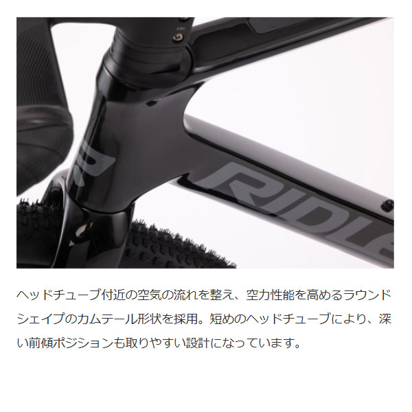 グラベルシーンで最前線を走るRIDLEY。近年のグラベルレースは、ますます荒れた過酷な地形と高速走行が相まって、バイクにはより高い安定性が求められています。時速30~35kmのレースでバイクの空力性能は走行に大きな影響を与えますが、それ以上に影響が大きいのがタイヤの転がり抵抗であり、荒れた路面での走行は身体への負担も大きくなります。ASTR RSはエアボリュームの多いワイドタイヤにより、転がり抵抗を軽減し快適性とグリップ力も向上させました。またフレーム単体で862g(Sサイズ)の軽量フレームを採用することで、登坂性能と快適な乗り心地を生み出しています。