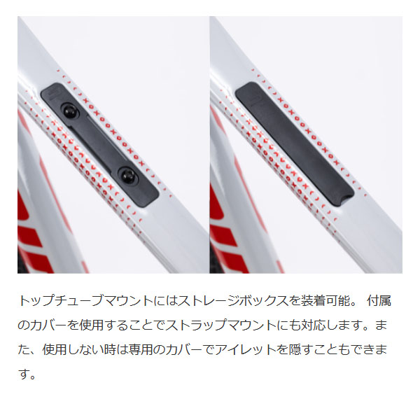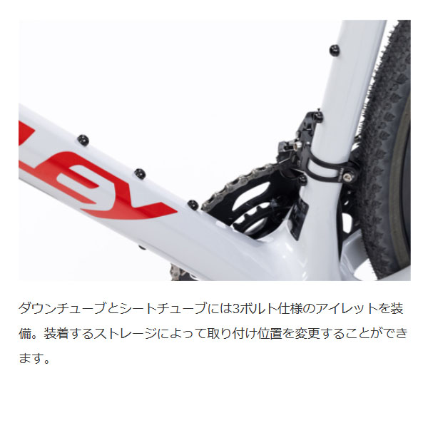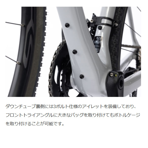 また、多数のアイレットを備えており、目的に応じてバッグやボトルケージ、その他のアクセサリーを装着することができます。38mmのタイヤクリアランスを設けており、コントロール性能にも優れ、快適な高速走行が可能です。フロントシングル仕様の場合は40mmタイヤまで装着可能です。