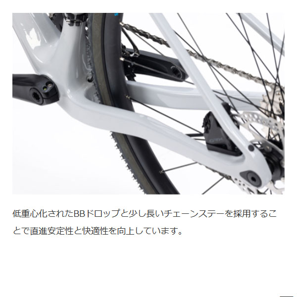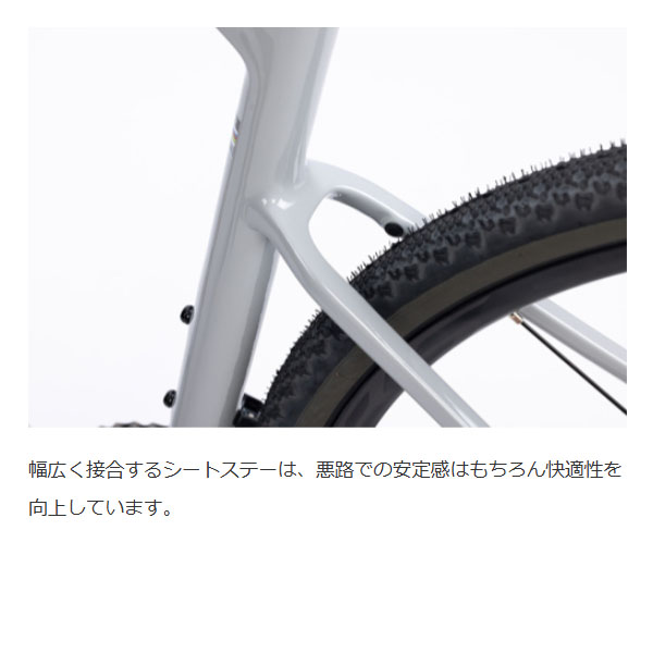 未舗装路においても安定したハンドリングを可能にするヘッドアングルと低重心化されたBBドロップ、快適性を高めるためのシートアングルなど、新しいフレーム形状とジオメトリーを採用。高い反応性により舗装路は軽快に、そして不安定な未舗装路でも安定した走行性能とアップライトな乗車姿勢によって、通勤やロングライドはもちろん、グラベルロードも含めた多様なスタイルと幅広い用途に対応します。