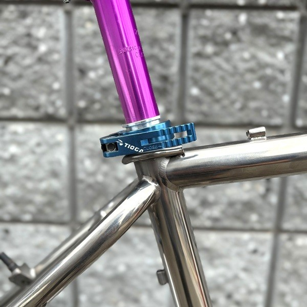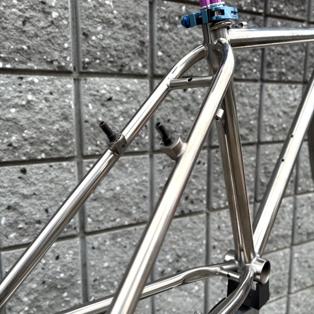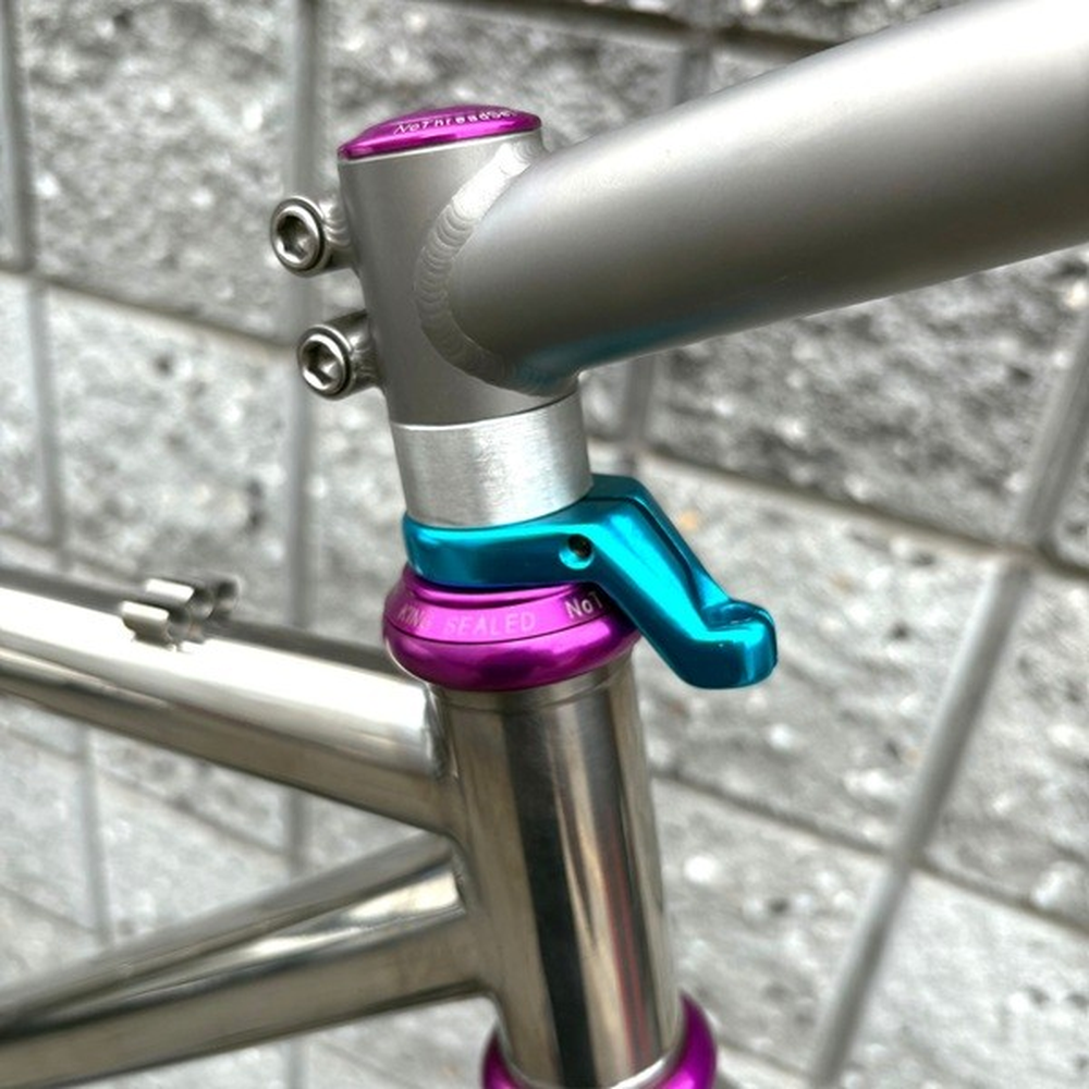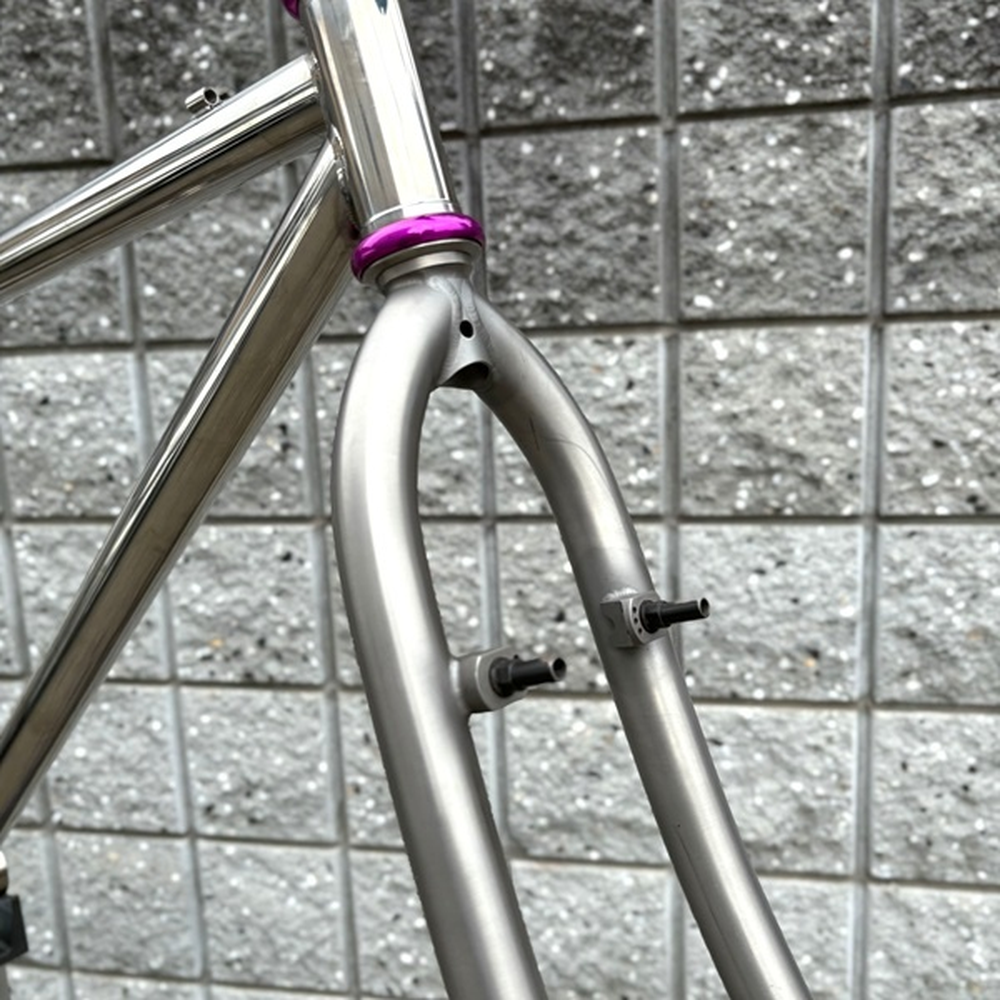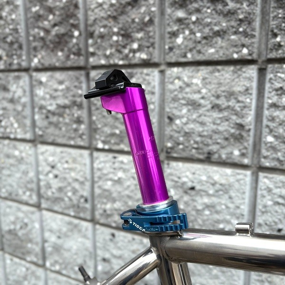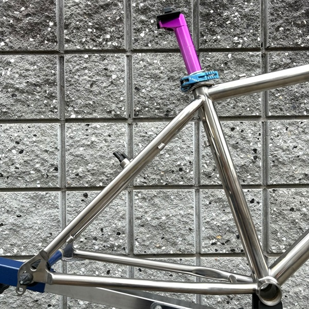 Chriskingのヘッドパーツに、AmericanClassicのシートポスト、チタンステムをアッセンブルしたオールド26インチ 対応したMTBチタンフレーム。ハイエンドなパーツに、パーツカラーはパープルとブルーでまとめられた特徴ある組み合わせです。