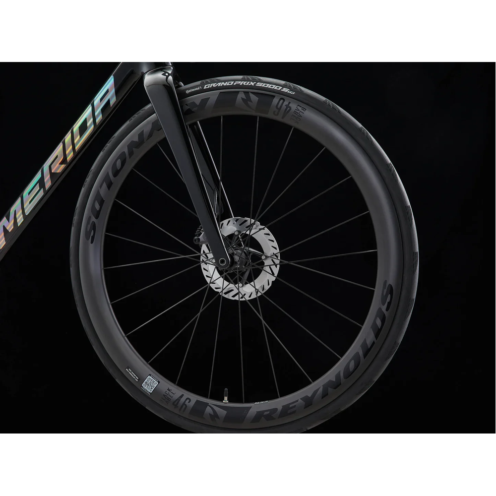 チームモデルと同じフレーム重量 861g(M サイズ ) を実現した SCULTURA CF5 フレームに、Shimano Ultegra Di2 をアッセンブルしたハイパフォーマンスレーシングモデル。MERIDA TEAM SL 1 ピースコックピットとミドルハイトのカーボンリムを採用したReynolds BL46 Expert により、空力性能と軽さ、乗り心地の両立はもちろん、精悍でクリーンなシルエットを実現。