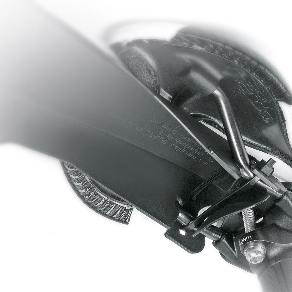 サドルレールに簡単に着脱できる軽量リアフェンダー、エスガードが引き締まった印象のオールブラックデザインにアップデート。タイヤのクリアランスを気にせず、お好みに応じてガード幅を調整することもでき、ワンタッチで着脱可能。取付部は厚く補強されており、耐久性も抜群です。