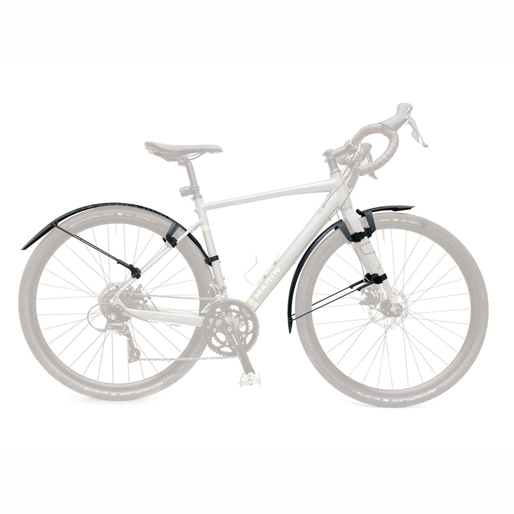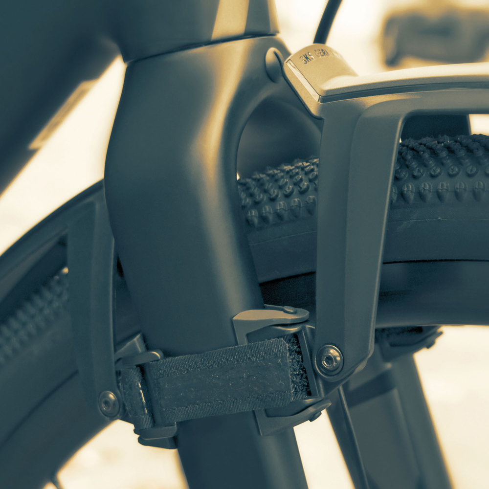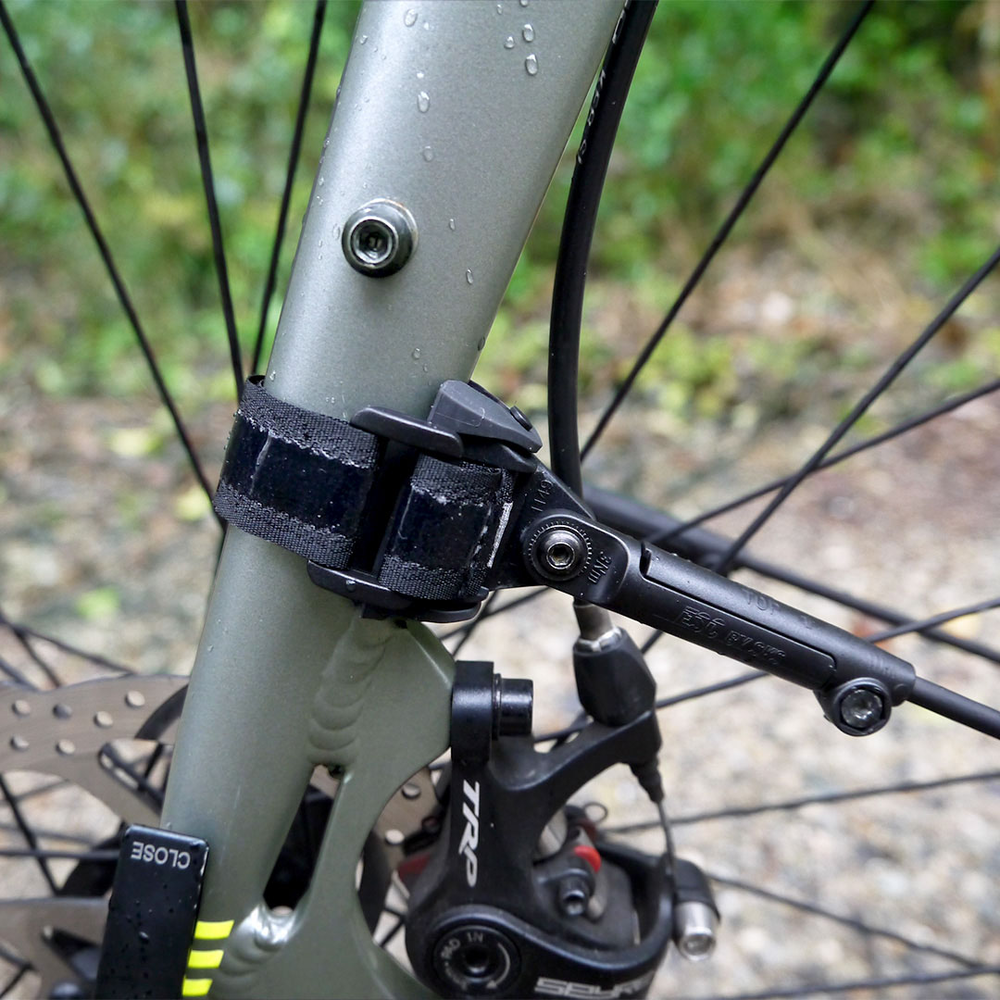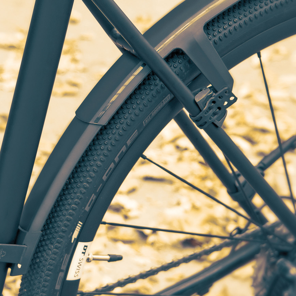 グラベルなどの未舗装路や悪天候などでも快適に使用でき、高い安定性を誇ります。ラバーバンドと面ファスナーを用いた取付けシステムのため工具を使わず取付けでき、ブラックの精悍なフォルムはあらゆる車体にフィットします。アルミ製のステーは広めに設計されており、42mm幅のタイヤまで対応し、タイヤとマッドガードのクリアランスを広めに確保します。